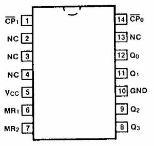 The '92 is a 4-stage ripple counter containing a high speed flip-flop acting as a divide-by-two and three flip-flops connected as a divide-by-six. HIGH signals on the Master Reset (MR) inputs override the clocks and force all outputs to the LOW state.